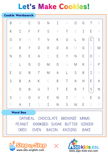 クッキーが焼きあがるの待つ間に、生徒たちはいろんな種類のクッキーについて学びました。今回のレッスンのレシピと言葉探しのワークシートは、無料でダウンロード可能です。ぜひあなたのレッスンに取り入れてみてください。