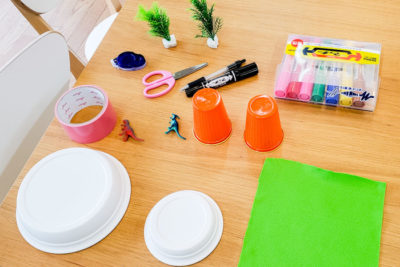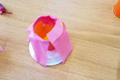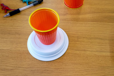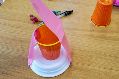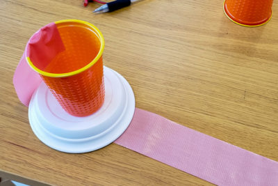 それでは火山を作りましょう!小皿の上にプラスティックカップを置きます。写真のようにカップの淵から底までテープを縦に貼ります。