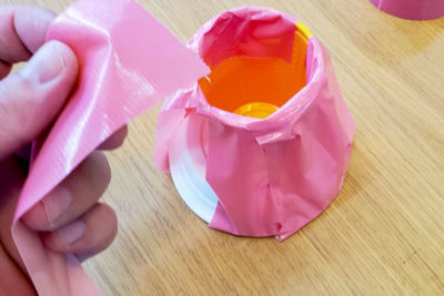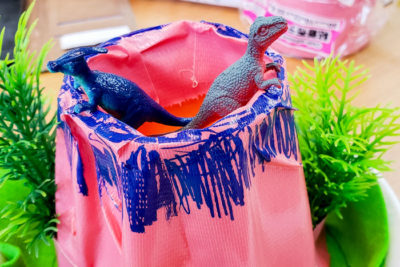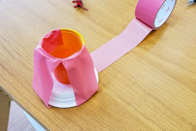 そこで今回は、海外のサイトに紹介されている「テープで簡単にできる火山について」のブログ から粘土の代わりにガムテープを使用する方法を思いつきました。見た目がかっこいい上に、短時間で作ることができます。子供たちが楽しめるようにカラフルなガムテープを用意しました。