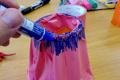 油性マーカーで火山の細かいデザインを書き足します。誰の火山か分かるように、お皿の底にイニシャルを書くのもお勧めです!(時間短縮のため、大人数のクラスではこの工程は省略できます)
