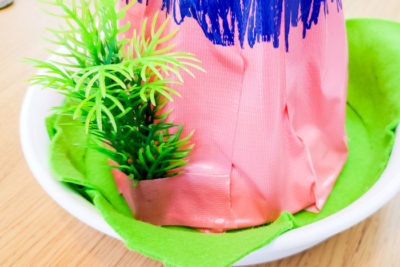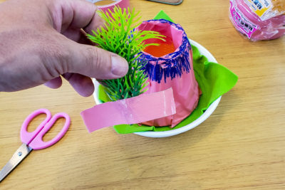 さらにクリエイティブな作業を楽しみましょう!テープを小さめに切り、人工の水草を火山の周りに貼り付けます。