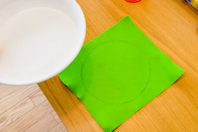 フェルトの上に中皿を置いて底のラインに沿って線を引き、“草”になるように丸くカットします。(この工程は時間の短縮や後片付けし易いように省略することもできます)