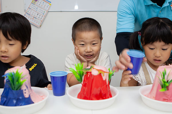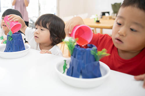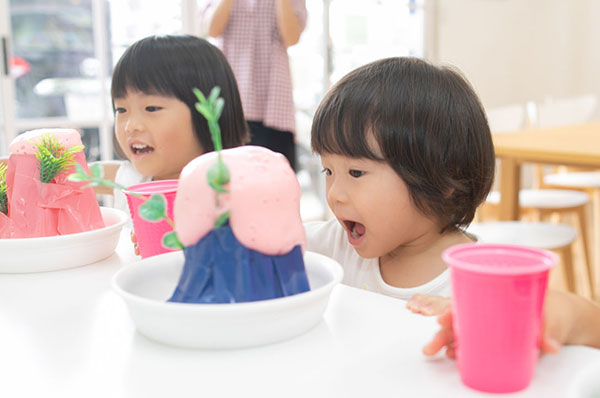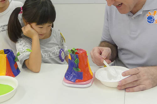 それでは用意した液体を素早く火山に入れてください。子供たちのリアクションを撮影できるようにカメラの準備をお忘れなく!
