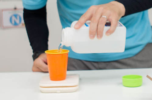 次に酢を30ml用意してください。お酢に食器用洗剤3gを加えると噴火の際にブクブクとした泡をつくることができます。